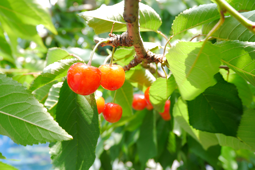 通常のさくらんぼは地面に反射シートを敷き光を射て着色する方法が一般的ですが、鈴木さんのさくらんぼは冬から選定作業をし、反射シートを使用せずたっぷりの太陽光を浴びる事で着色のいい大粒の美味しいさくらんぼに仕上がります。